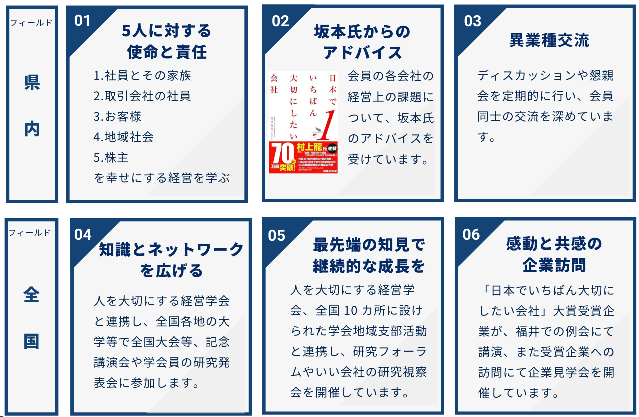現在は、元法政大学大学院政策創造研究科教授、人を大切にする経営学会 学長 坂本光司氏のご支援の下、下記の事業を展開しています。